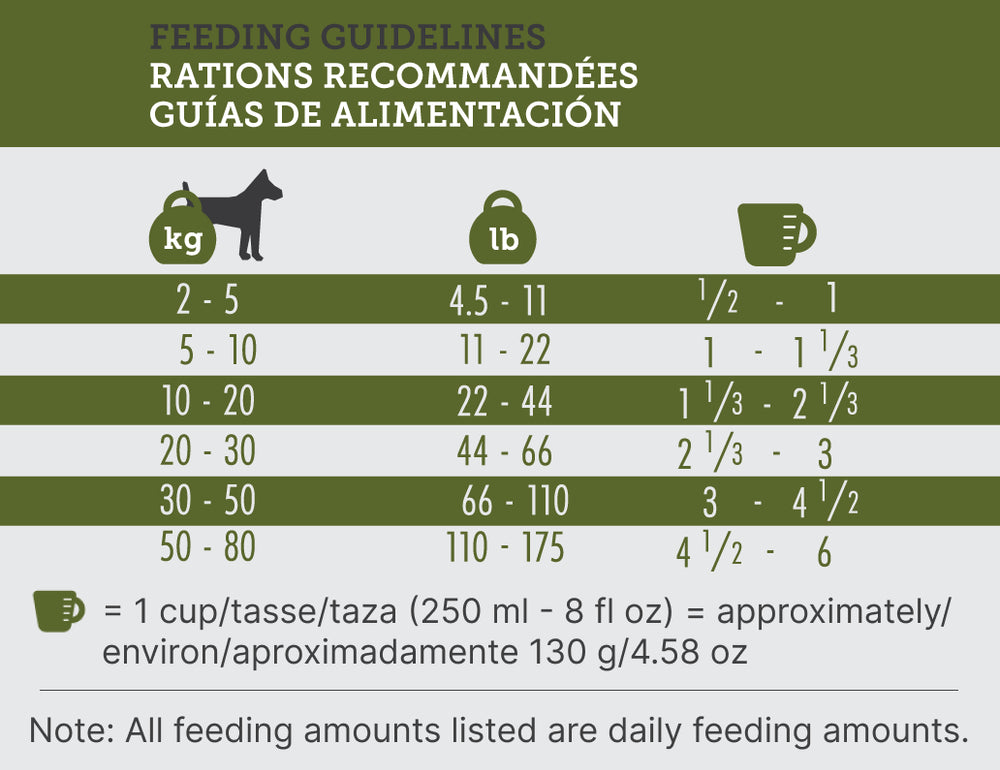 • Feed daily per the bag’s chart; adjust for activity and body condition.